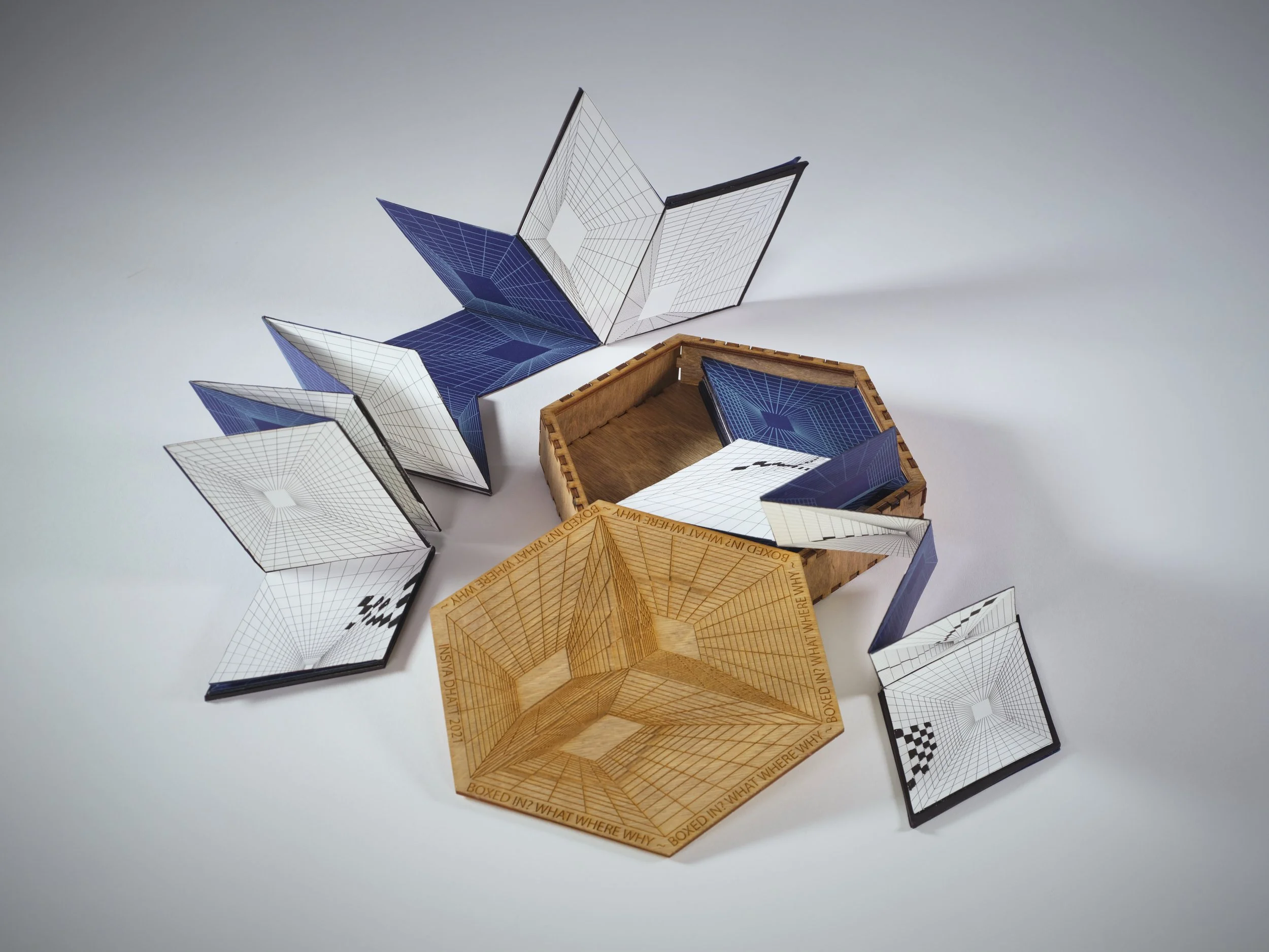 Boxed in? What, Where, Why was created as a response to experiences Dhatt believed she had moved beyond, only to discover through events during and following the Covid epidemic that she was not beyond them. The physical confinement due to the pandemic, the toxic political environment, and social injustices heightened her personal exposure to compartmentalization and categorization. Structures of race, gender, color, environment, family, and country of birth provide advantages and disadvantages to our lives. To express this, Dhatt’s three separate books combine into a singular shape, posing questions about what we are boxed in by, where associations of being boxed in come from, and how disadvantages arise due to biases.