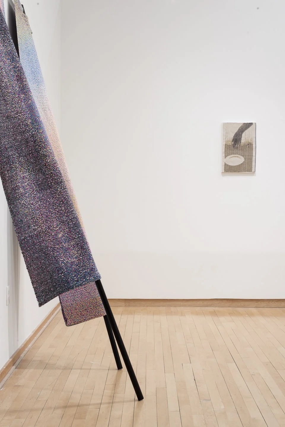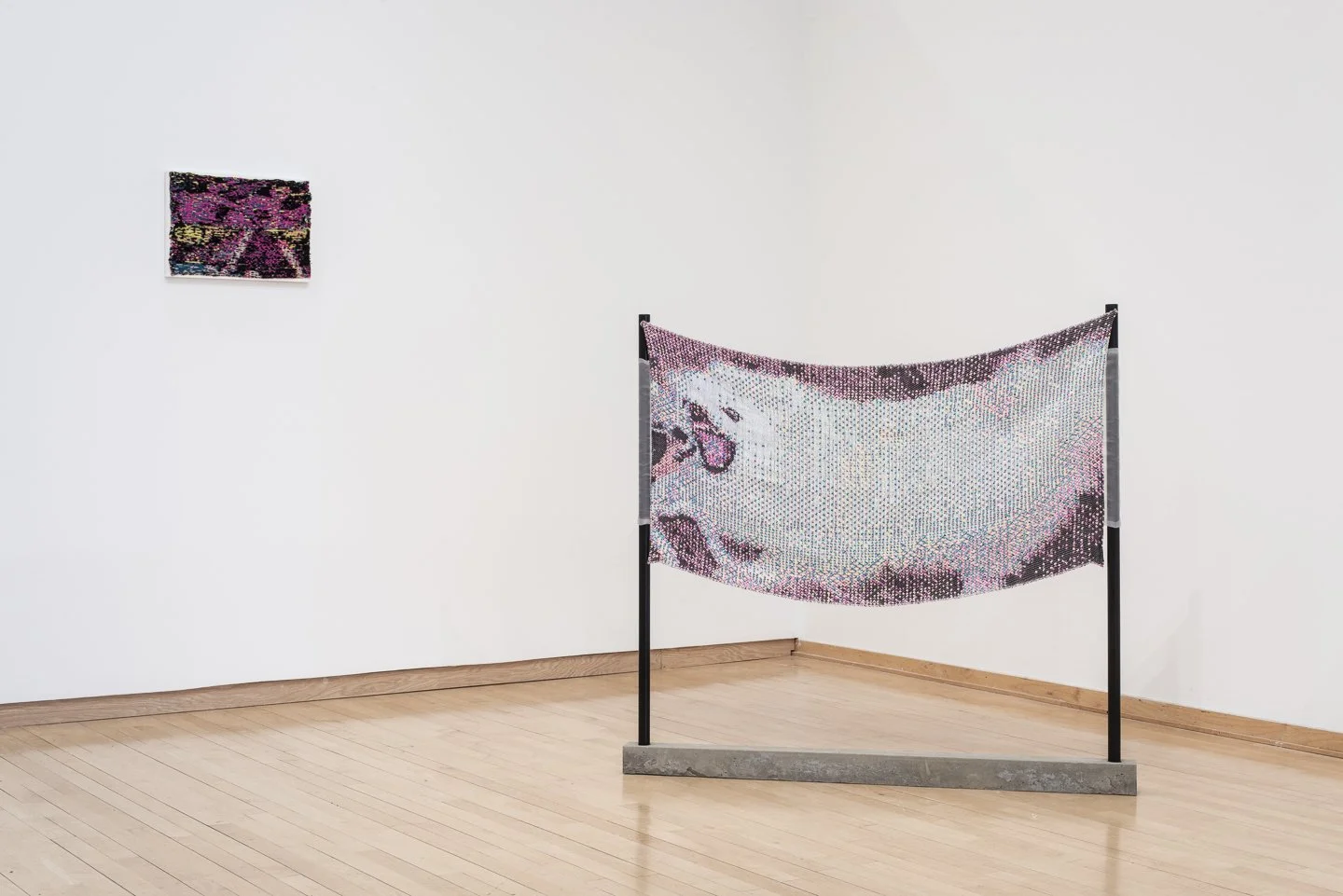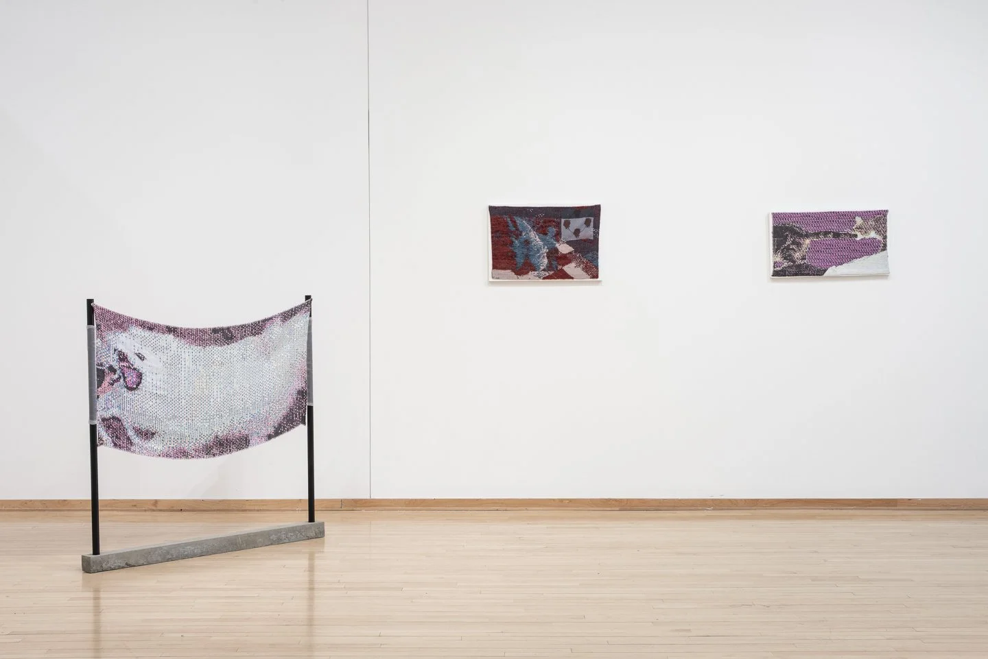 Installation View. Les vagues se heurtent et gémissent, 2022 wool, mohair, cotton, dye, organza, gesso on panel Dogfight, Chewey and Baby, 2022 silk, wool, cotton, organza, enamel, wood. Photo credit: Neighboring States.