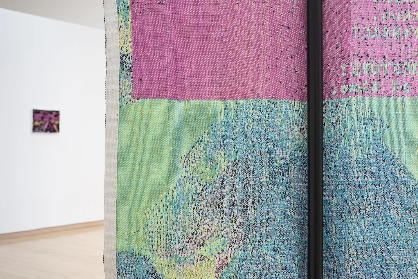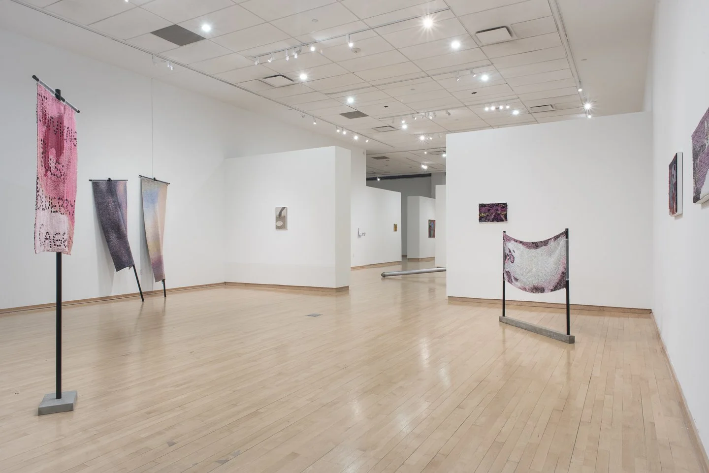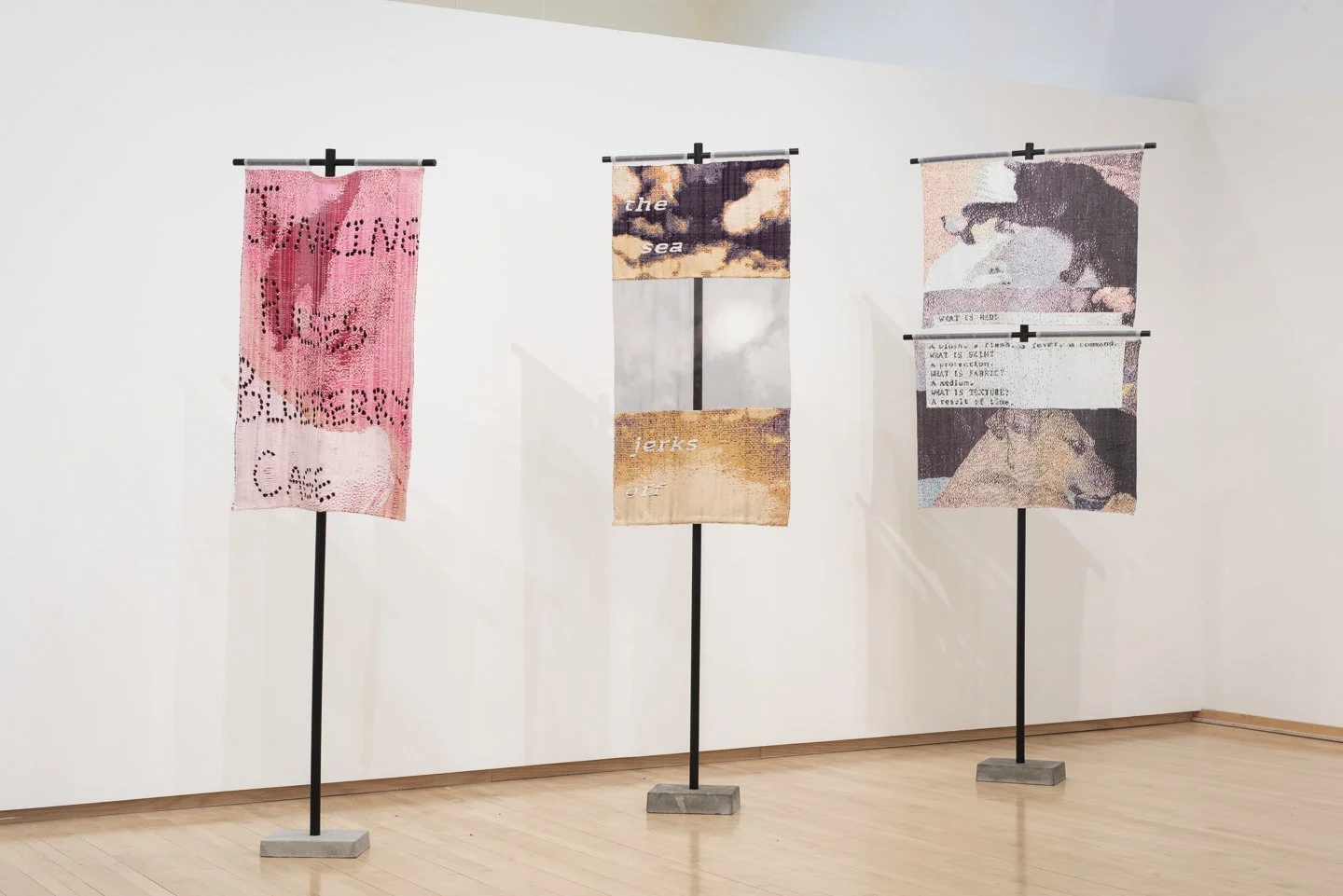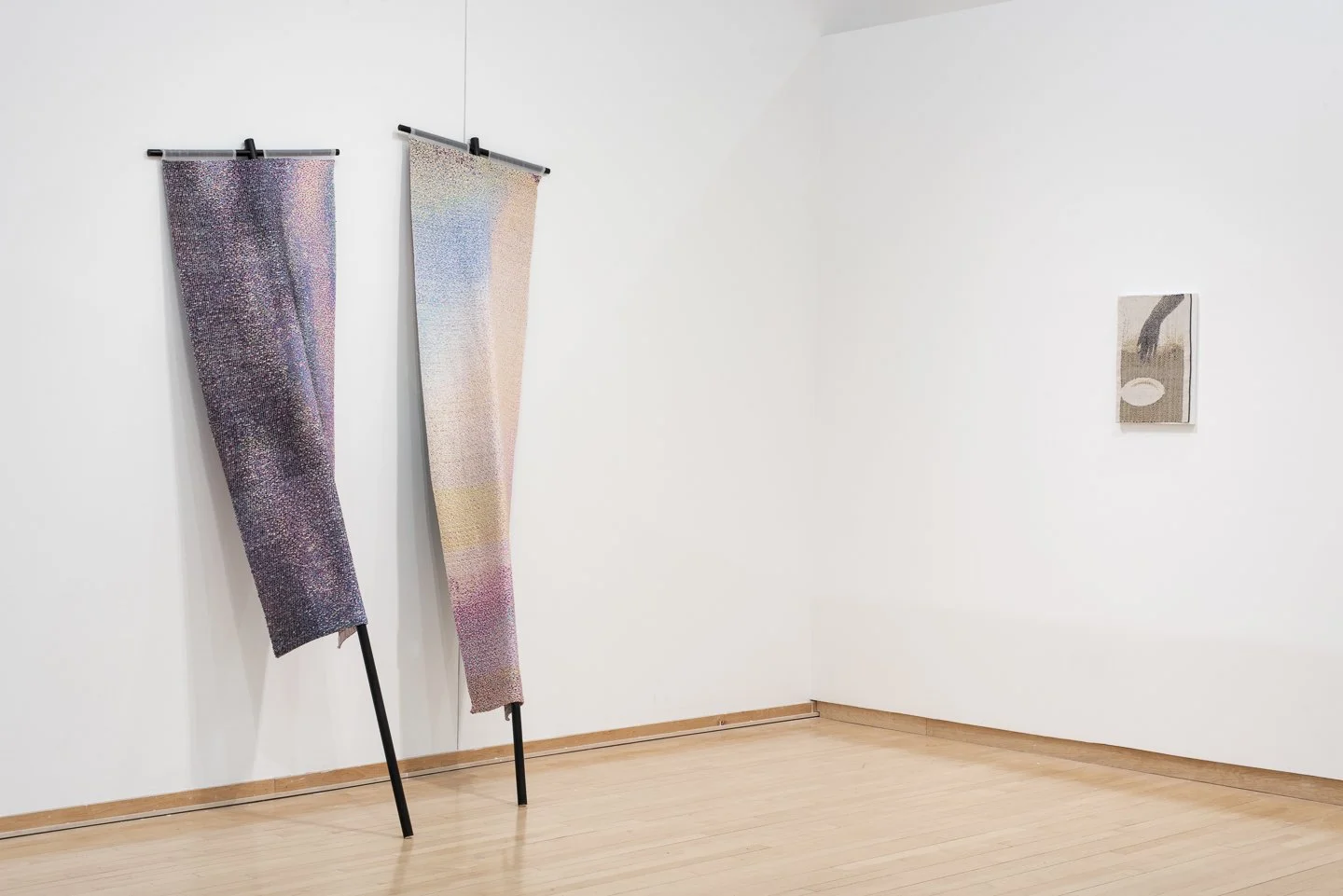 Installation View. Junking Pulses, 2022 silk, wool, cotton, dye, organza, enamel, wood, concrete; The Sea, 2022 silk, wool, cotton, dye, ink, organza, enamel, wood, concrete; A blush, a flush, a fever, a command, 2022 silk, wool, cotton, organza, enamel, wood, concrete. Photo credit: Neighboring States.