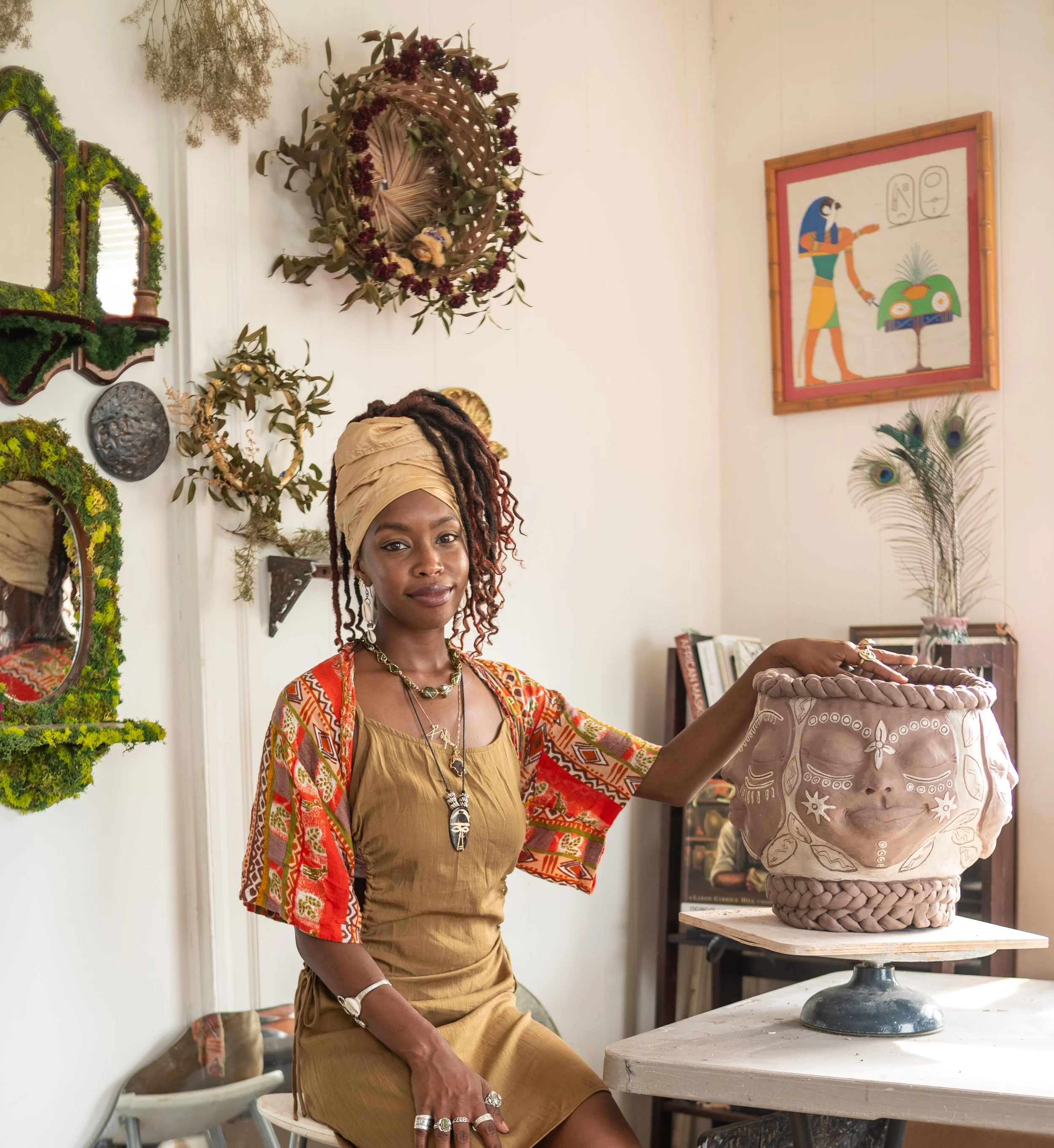 Angelique Scott is a Caribbean-American artist, educator, and activist whose artistic practice is rooted in intergenerational traditions of care and craftsmanship. Drawing from Afro-diasporic material culture, she works primarily with clay, fiber (including hair, satin, and cotton), cowrie shells, and indigo to create both functional and decorative objects. Her work is grounded in Afrocentricity and Africana womanism as frameworks for embodied understanding.