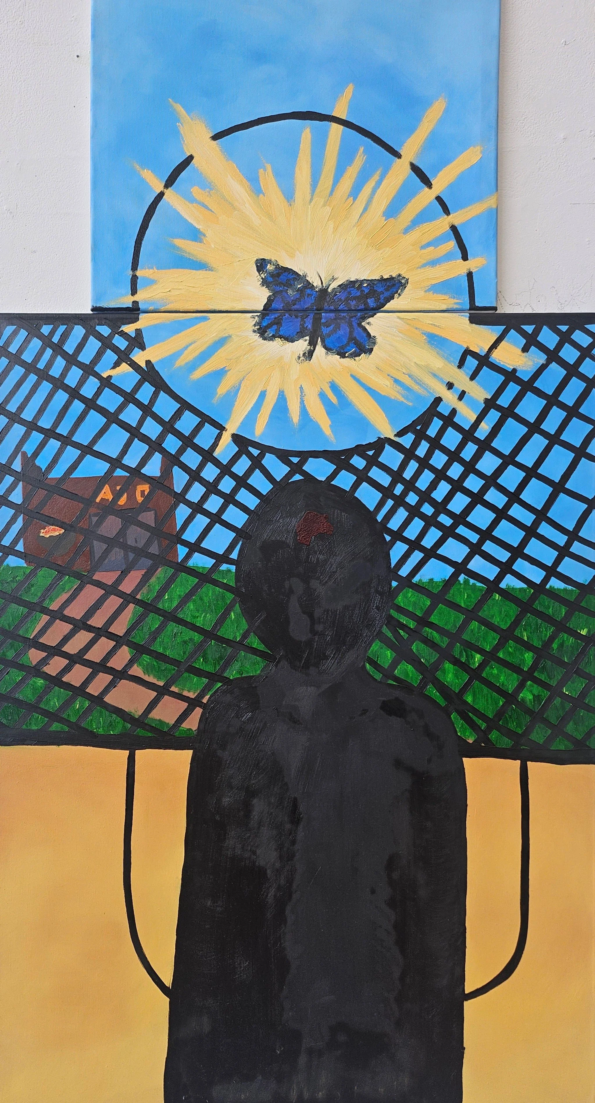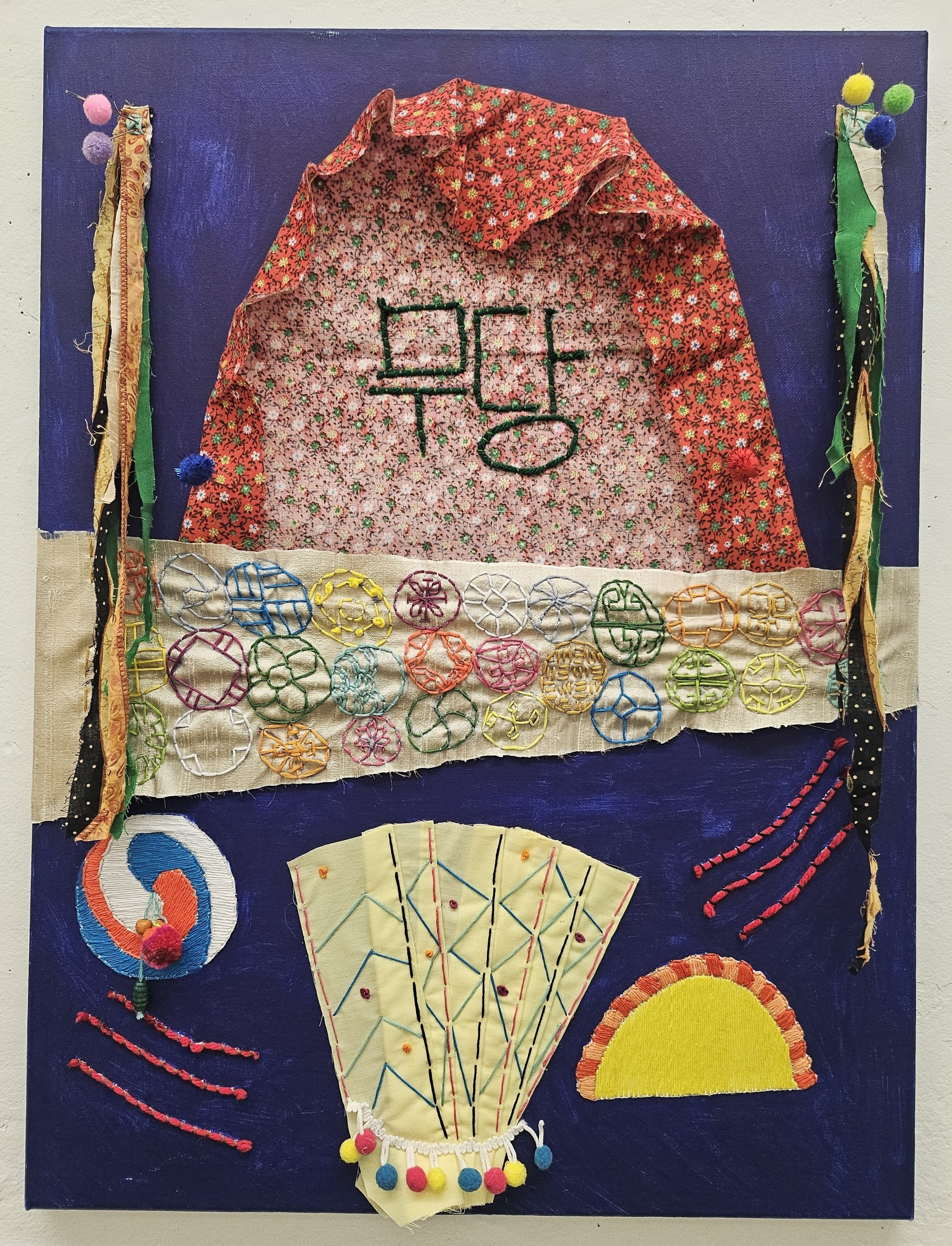 "Shamanism: 2024, acrylic paint, embroidery, 16" x 20"