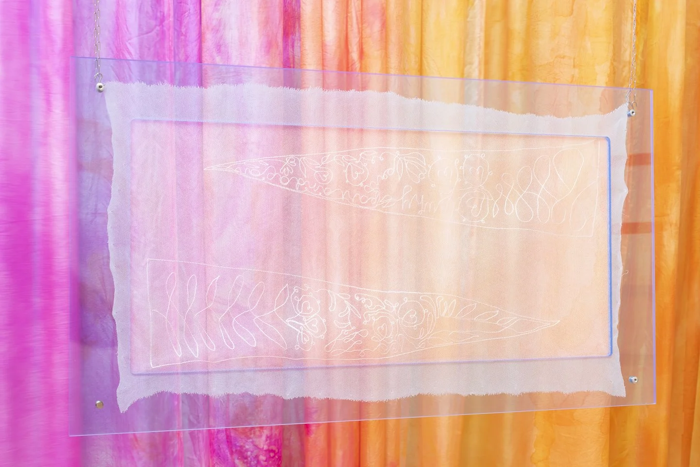 Artist Clare Nicholls writes poems in dream-like fragments, and embraces textiles as evocative holders of cultural memory. Layering handmade lace with silk painting, her work speaks concurrently about surface, image, and object as a complex and entangled whole. Clare’s fiber objects and images are grounded in personal research in witchcraft and somatic traditions, with emphasis on experimental poetry, mythology, and oral histories. Originally from Baltimore, Maryland, Clare earned a BA in Art and Art History from St. Mary’s College of Maryland in 2010, and obtained a Post-Baccalaureate Certificate from MICA in 2013. She has since earned an MFA in Fiber & Materials Studies at Tyler School of Art and Architecture in Philadelphia, Pennsylvania in 2022. Her work has been exhibited in several venues on the east coast, most recently in Future Tense, a juried exhibition for the Surface Design Association. She lives and works in Philadelphia, Pennsylvania.