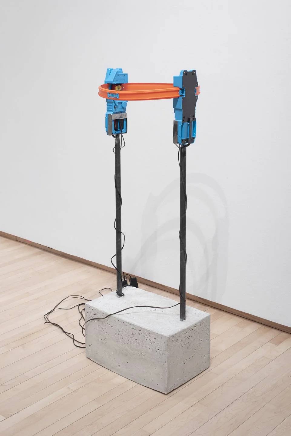 Particle Accelerator 2023 Cement, steel, wood, electrical wiring, Hot Wheels track and car 4’ x 22” x 13” Photo credit: Neighboring States