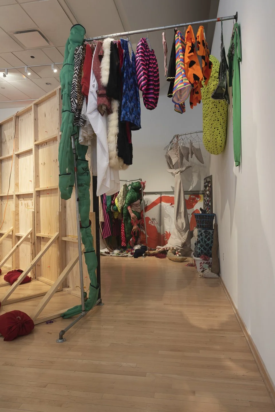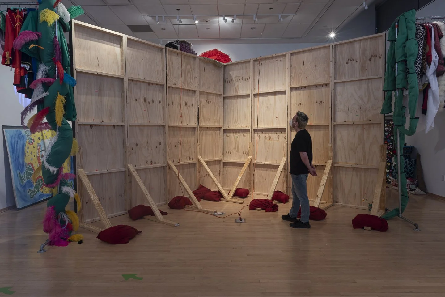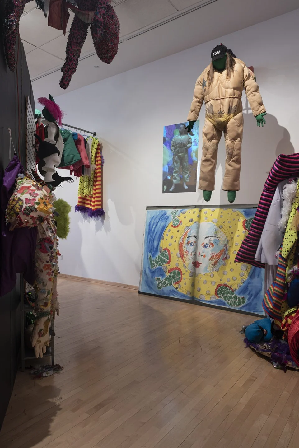 Feather Chiaverini (they/them) is an artist who makes costumes, props, and performances that explore issues related to poverty, skill, and generational roles. Feather’s work is informed by the theatrical trades and material-vocabularies of their ancestry; Feather’s mother was an actress, their father owned a costume shop, and their grandfather was a professional clown. Inspired by devised theater techniques and the everyday hustle of their family, Feather builds immersive installations, soft sculptures, and digital environments to imagine new futures and create utopias made possible by the familial knowledge they were able to inherit. Feather is interested in the roles we intentionally and/or unintentionally wear, interrogating the difference between a costume made in fear and one made in hope. Interest in the multiple roles of costume began early for Feather, as they witnessed the many lives and stories one costume could possess without ever sacrificing its origin. With resilience and pluralism, they create props and costumes that are in a constant state of becoming. Feather embraces an amateur or ‘de-skilled’ aesthetic, elevating the utilitarian and everyday object in the process. Their aesthetic and the quickness with which they make and manipulate materials speaks to the resilience and resourcefulness of Queer, DIY communities.