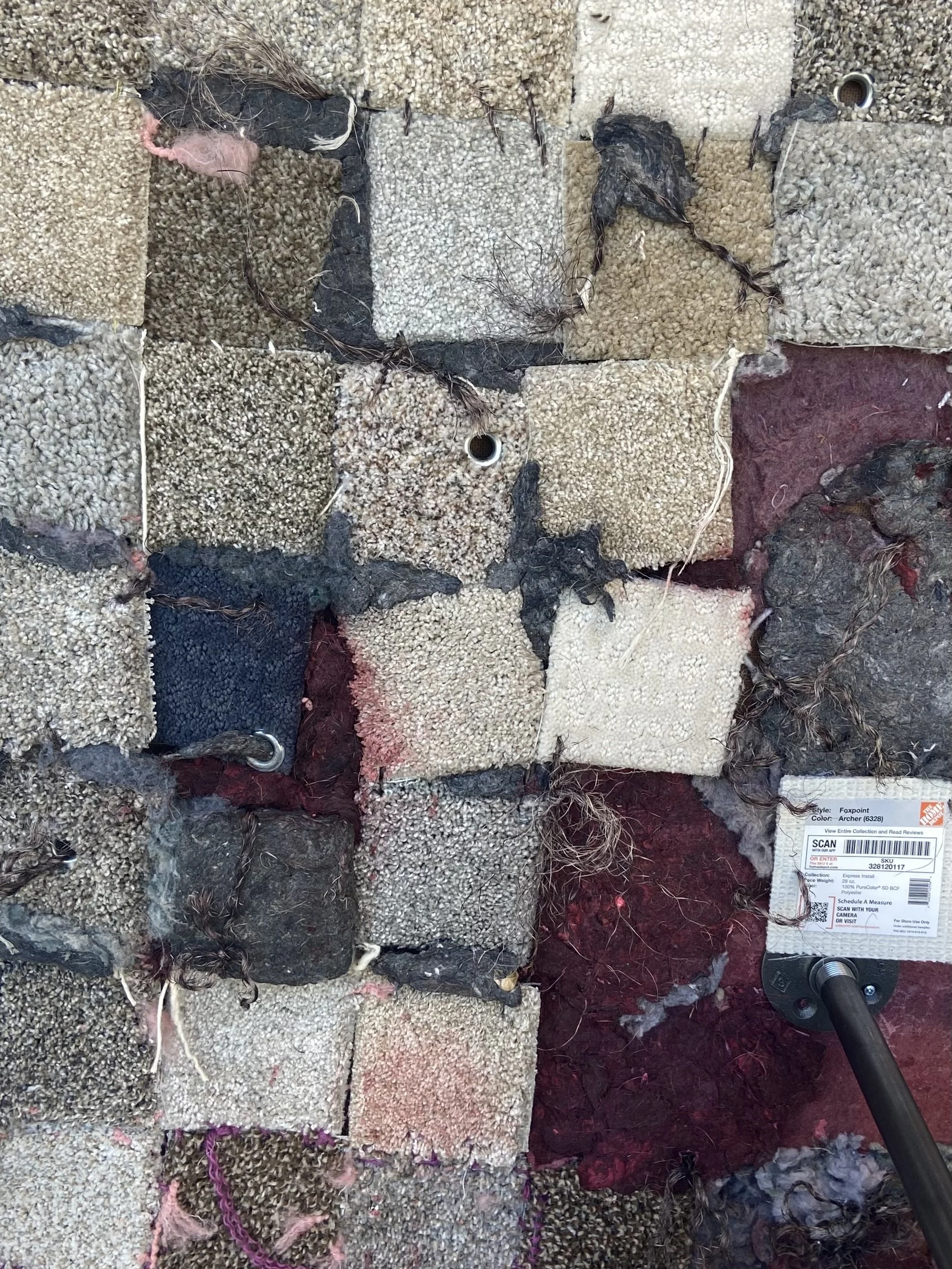 “Silver Tails,” 50” x 12” , Home Depot Carpet Squares, lint, skin, and sisal