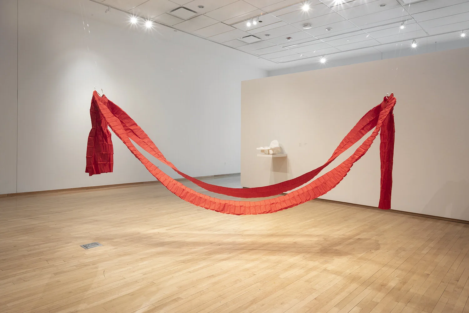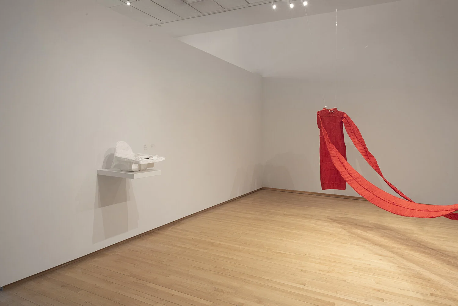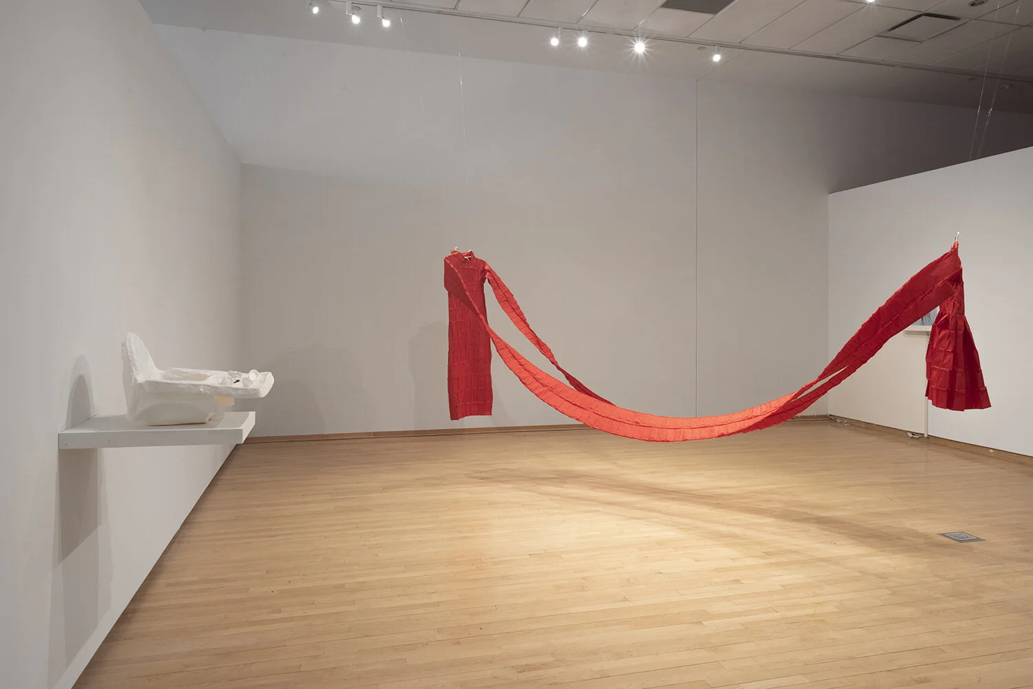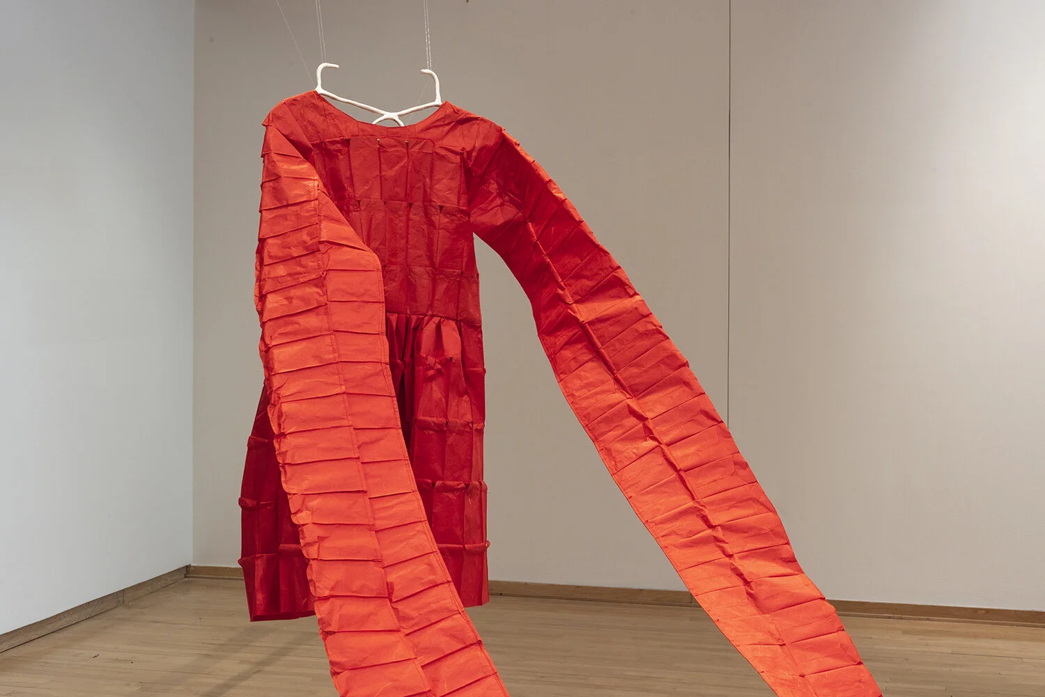 "Double Hanger(s)", 2020-2021, Porcelain, 5.25” x 14” x .25”. "Lucky Garment (for Two Sisters)", 2021, Stitched unryu paper & madder dyed silk, 56” x 18” x 148”. Photo credit: Neighboring States