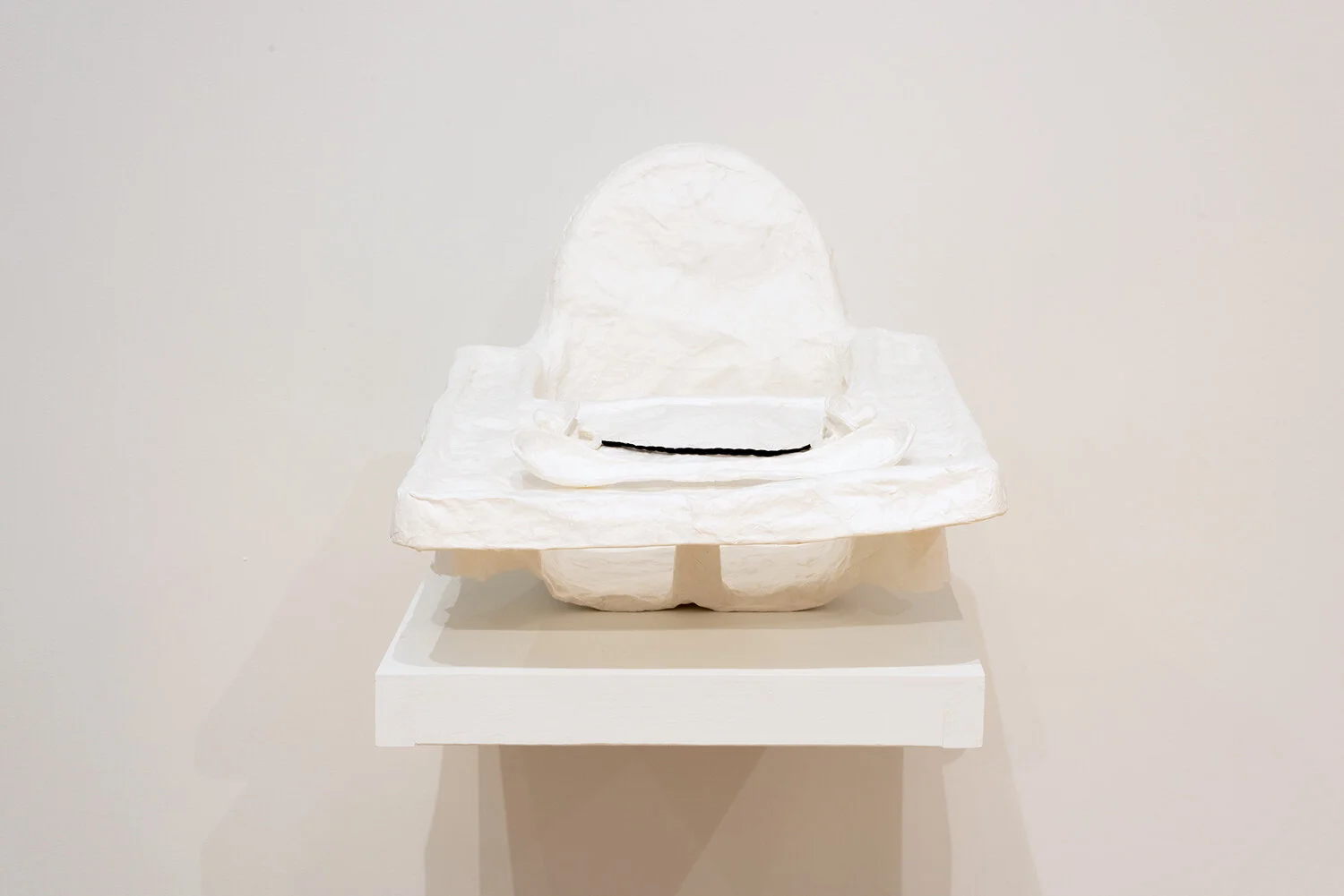 "Pacifier (for two sisters)", 2020, Unryu paper & braided hair, 1.5” x 2.5” x10”. "Soup Spoon (for two sisters)", 2020, Unryu paper, 1” x 11” x 1.5”. "High Chair (for one daughter)", 2021, Unryu paper, 14” x 16” x 18”, Photo credit: Neighboring States.
