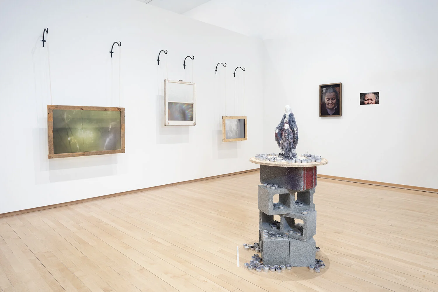 "Exhalations of Family and Ground from Brothers Grave", 2021, Preservation Jars, Labels, Scrap Wax, Breath of Family Members, Ground from Justin’s Grave, Legs of Prayer Bench, Found Scrap Quilt, 60”x48”x6”. Photo credit: Neighboring States