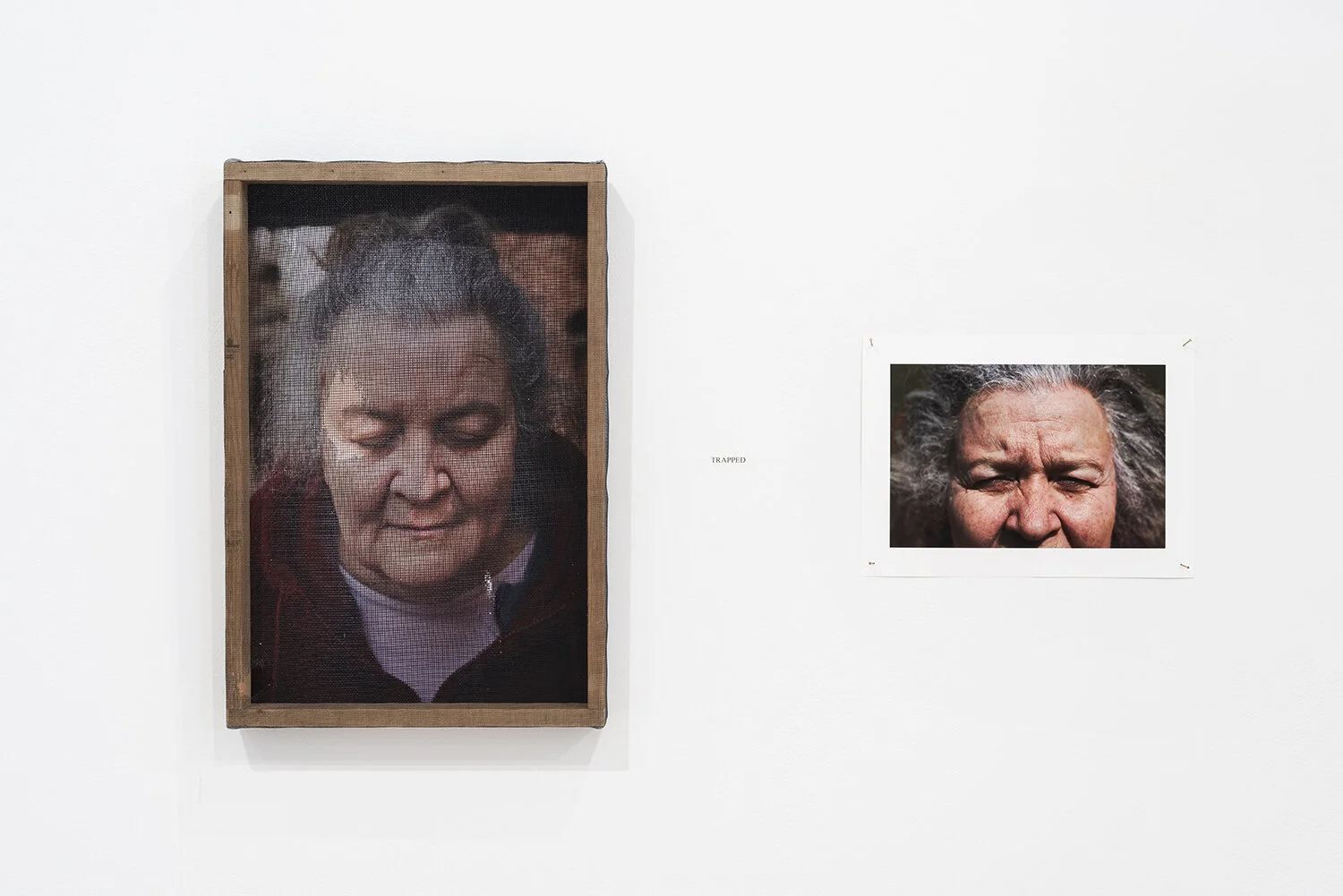 “Trapped”, (left wall), 2021, Digital Photograph of Mom Behind a Screen, Torn Screen, Scrap Wood, 24”x16”x2”