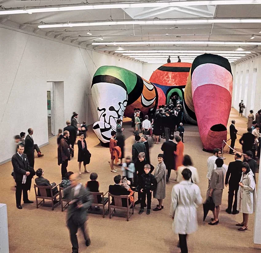 Niki de Saint Phalle, with Jean Tinguely and Per Olof Ultvedt, Hon – en katedral (She – A Cathedral), 1966 (June 4 – September 4, 1966), welded steel rebar, fabric, carpenter's glue, paint; incorporating cinema, bar, planetarium, children's slide, and interactive kinetic works, Approx. 28 m (92 ft) long × 23 m wide × 6 m (20 ft) tall; approx. 6 tonnes, Dismantled at close of exhibition per the work's conception. Surviving head preserved in the permanent collection of Moderna Museet, Stockholm