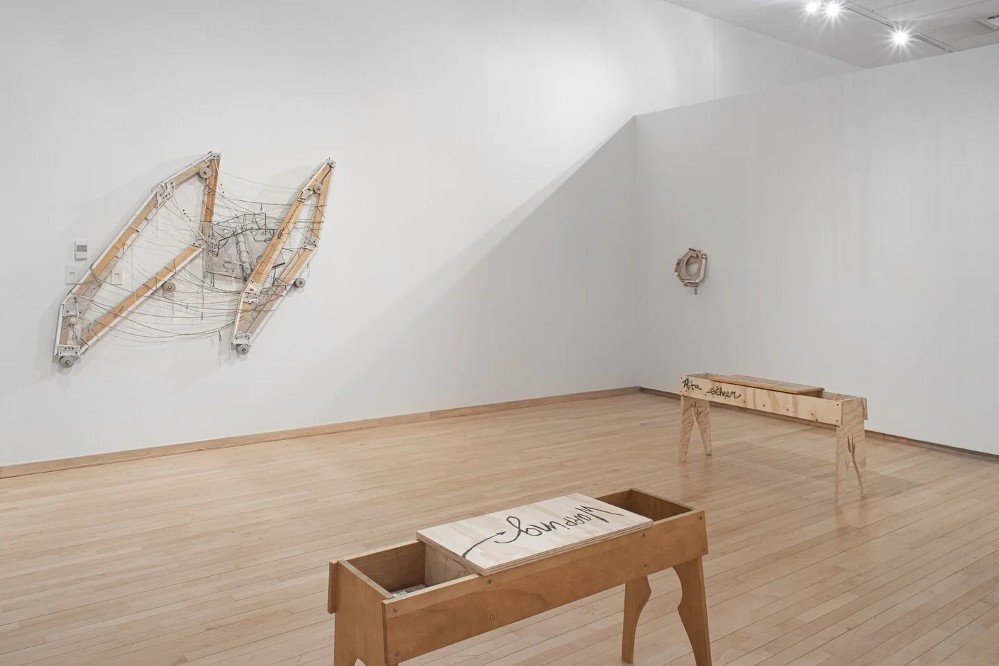 Loomhouse Drawing Installation View Two stretcher bars, drawing (graphite on mylar), powerline insulators, handwoven cloth hinges, wooden brackets, stencils used to make brackets, and yarn. 72” by 60” by 5”. Photo credit: Neighboring States. Outside Edge Installation View Stretcher bar (scraps) and four wooden brackets. 10” by 12” by 5”. Photo credit: Neighboring States.