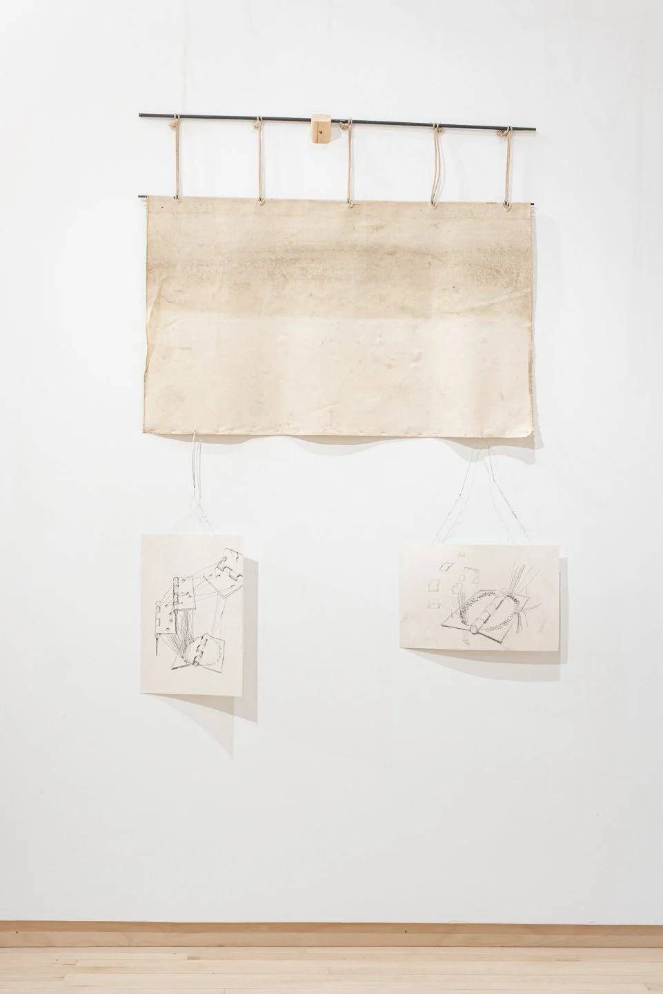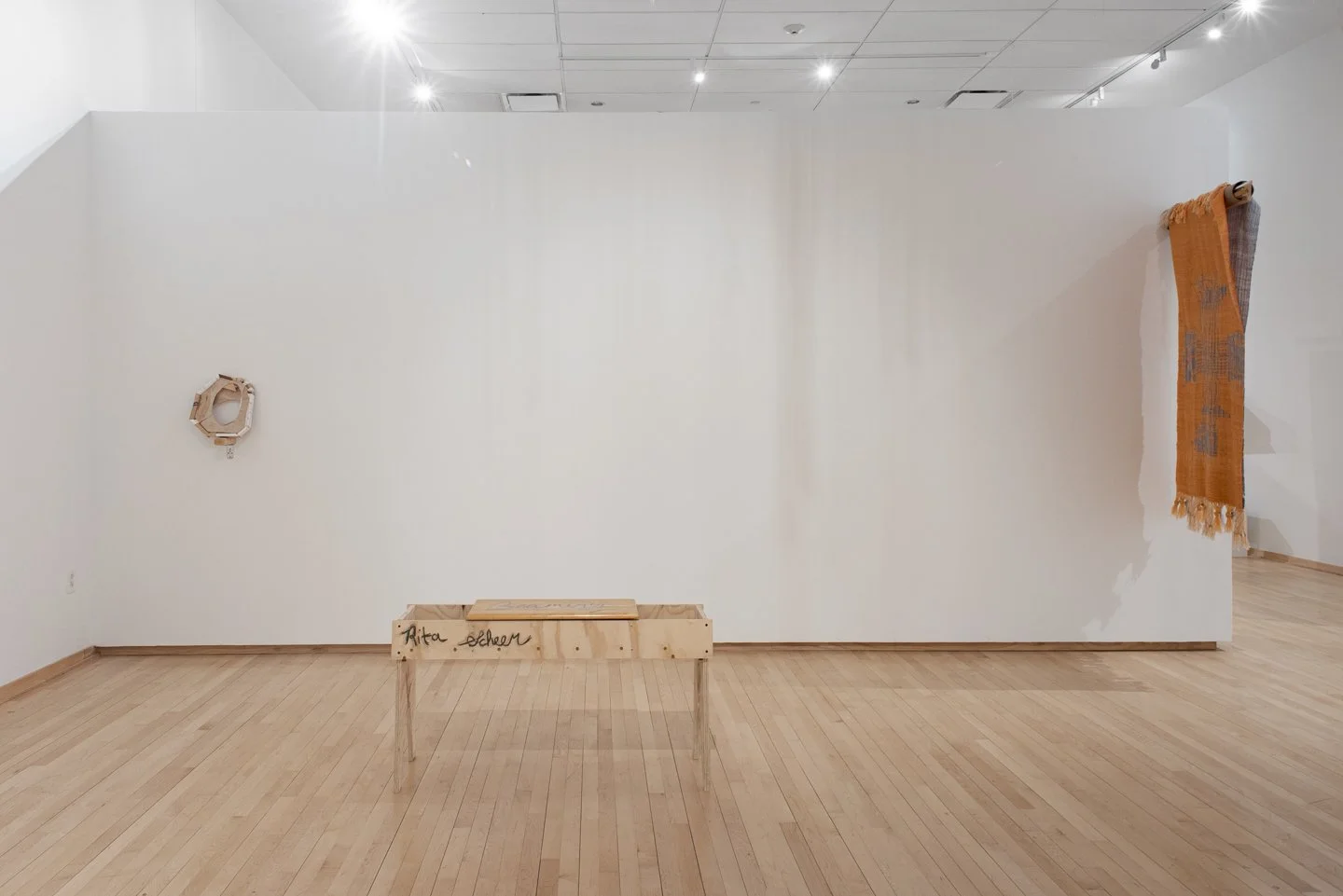 Hingecloth Installation View Doublecloth weaving, hinge, stretcher wood, lease stick, tube. 72” by 24” by 5”. Photo credit: Neighboring States. Outside Edge Installation View Stretcher bar (scraps) and four wooden brackets. 10” by 12” by 5”. Photo credit: Neighboring States.