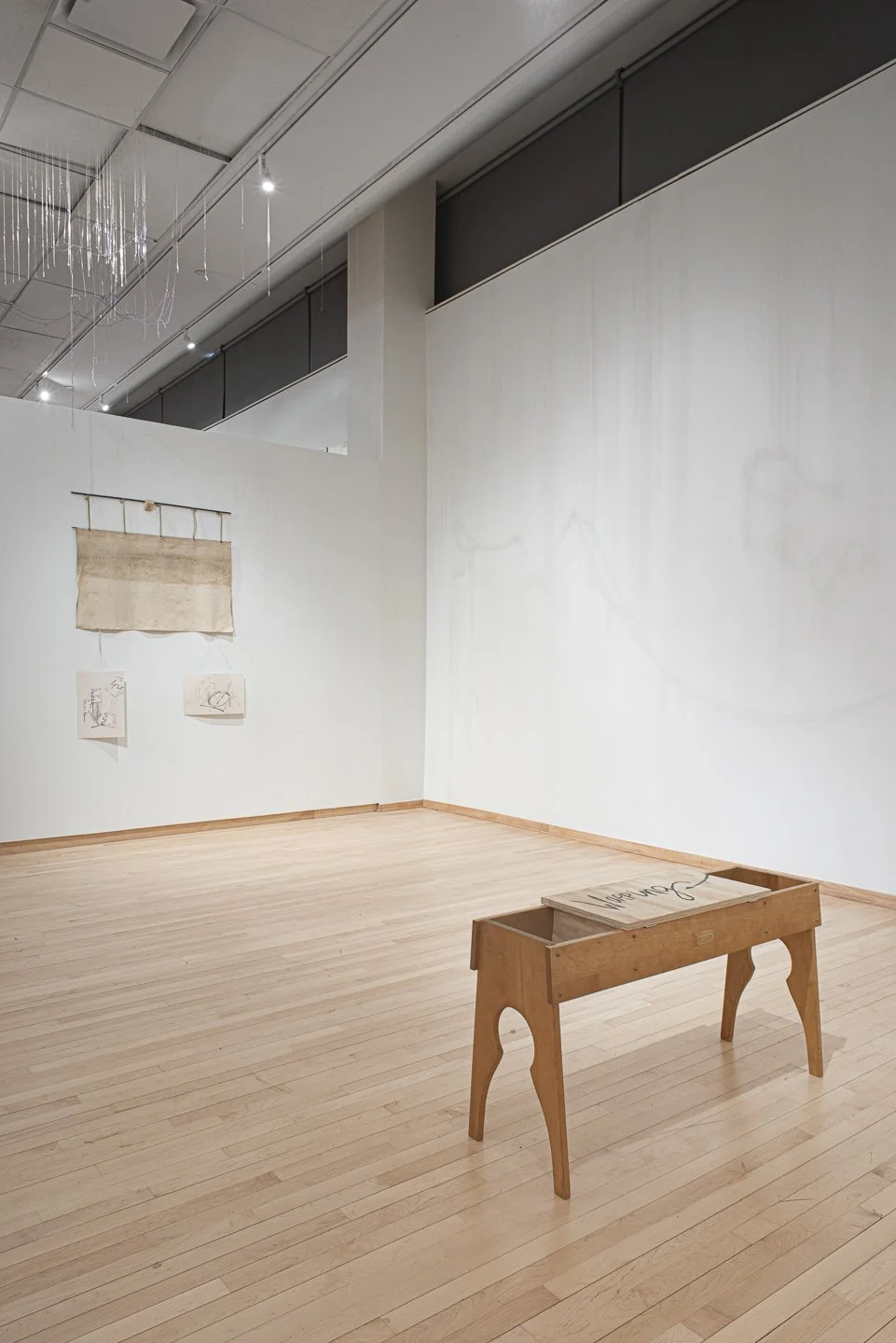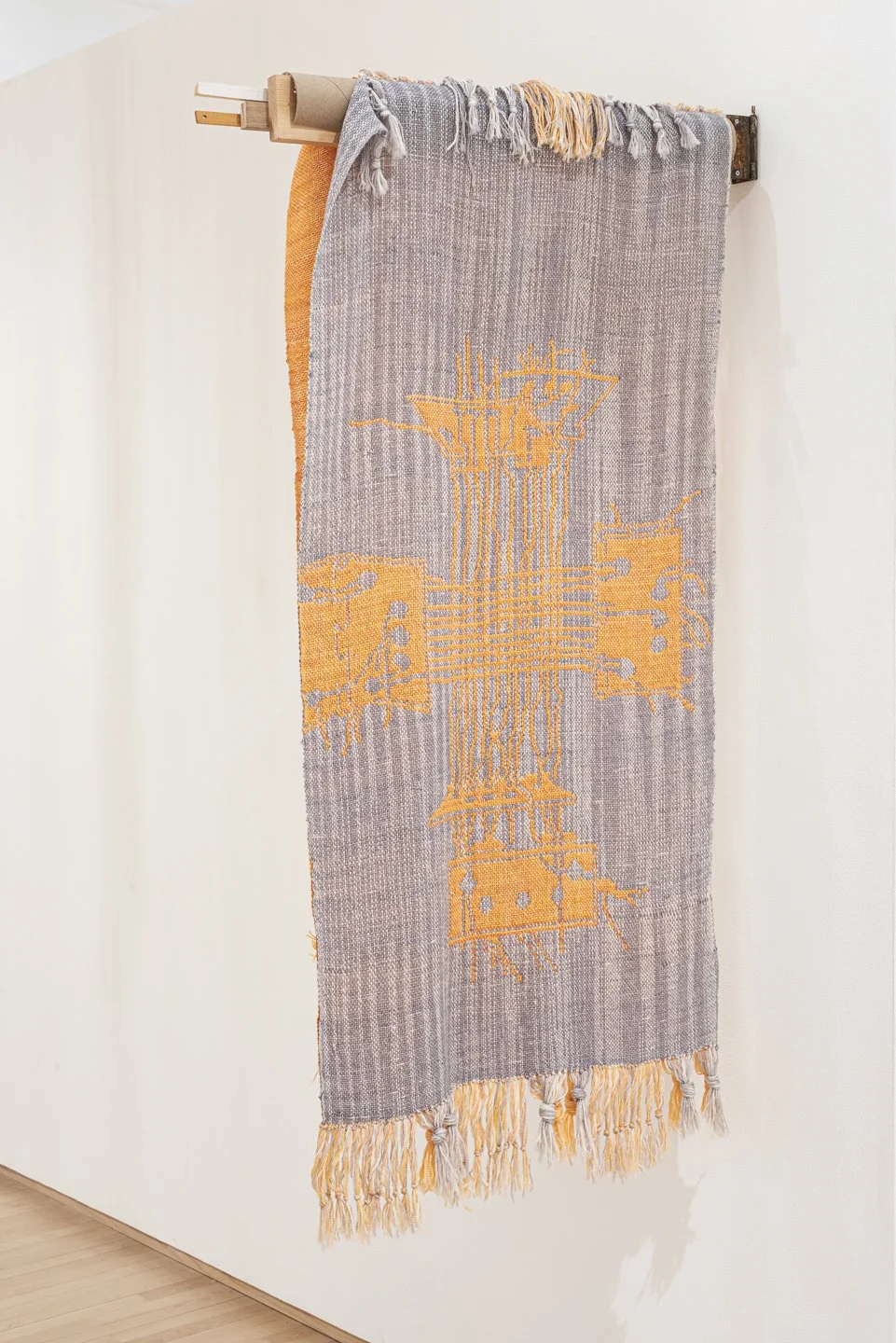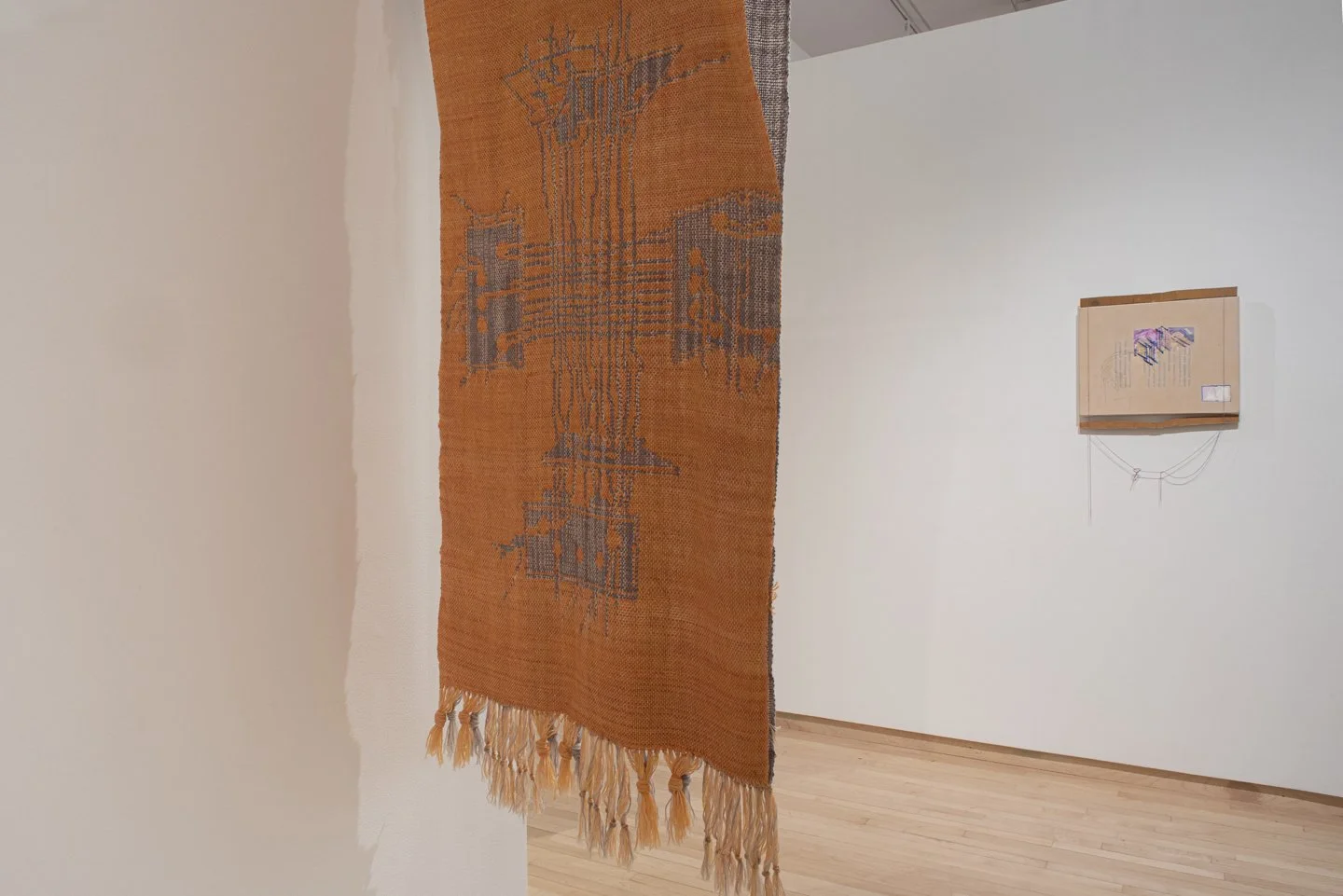 Hingecloth Installation View Doublecloth weaving, hinge, stretcher wood, lease stick, tube. 72” by 24” by 5”. Photo credit: Neighboring States. Like an Exhalation Installation View Acrylic on canvas, MDO, handdyed yarn loops. 8in x 36in x 1in. Photo credit: Neighboring States.