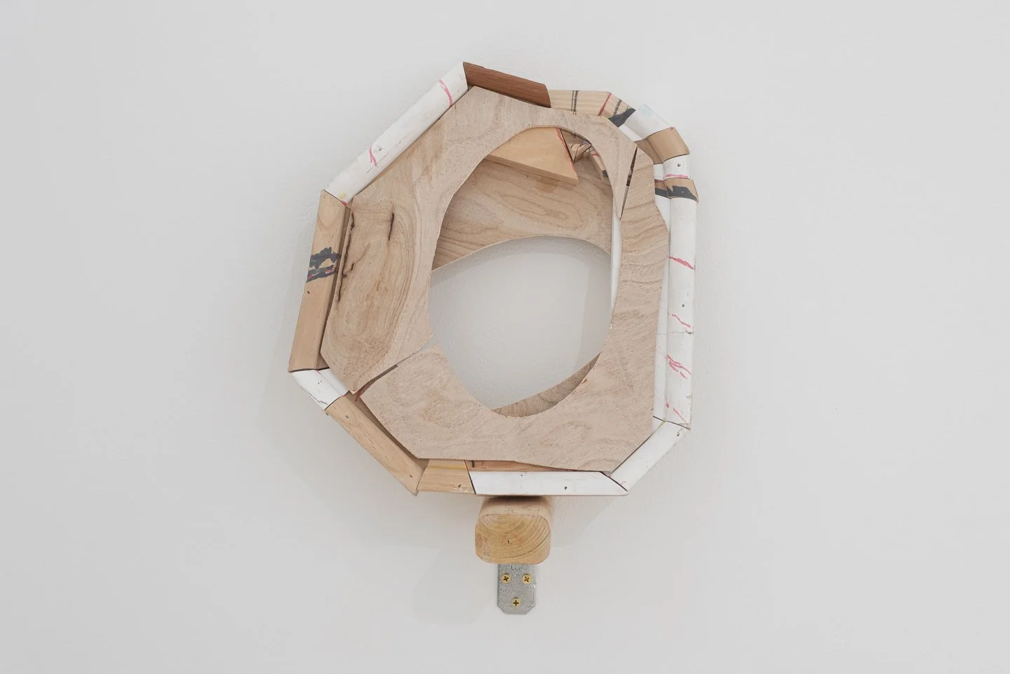 Outside Edge Stretcher bar (scraps) and four wooden brackets. 10” by 12” by 5”. Photo credit: Neighboring States.