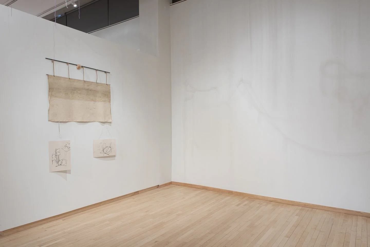 Heldbuilding Installation View Installation, heddles, handdyed yarn, washers, ceiling tiles. 264” by 384” by 36”. Photo credit: Neighboring States. Blanketmobile Installation View Loom blanket, heddles, steel yarn, wooden hook, drawings (graphite on paper). 70” by 60”. Photo credit: Neighboring States.