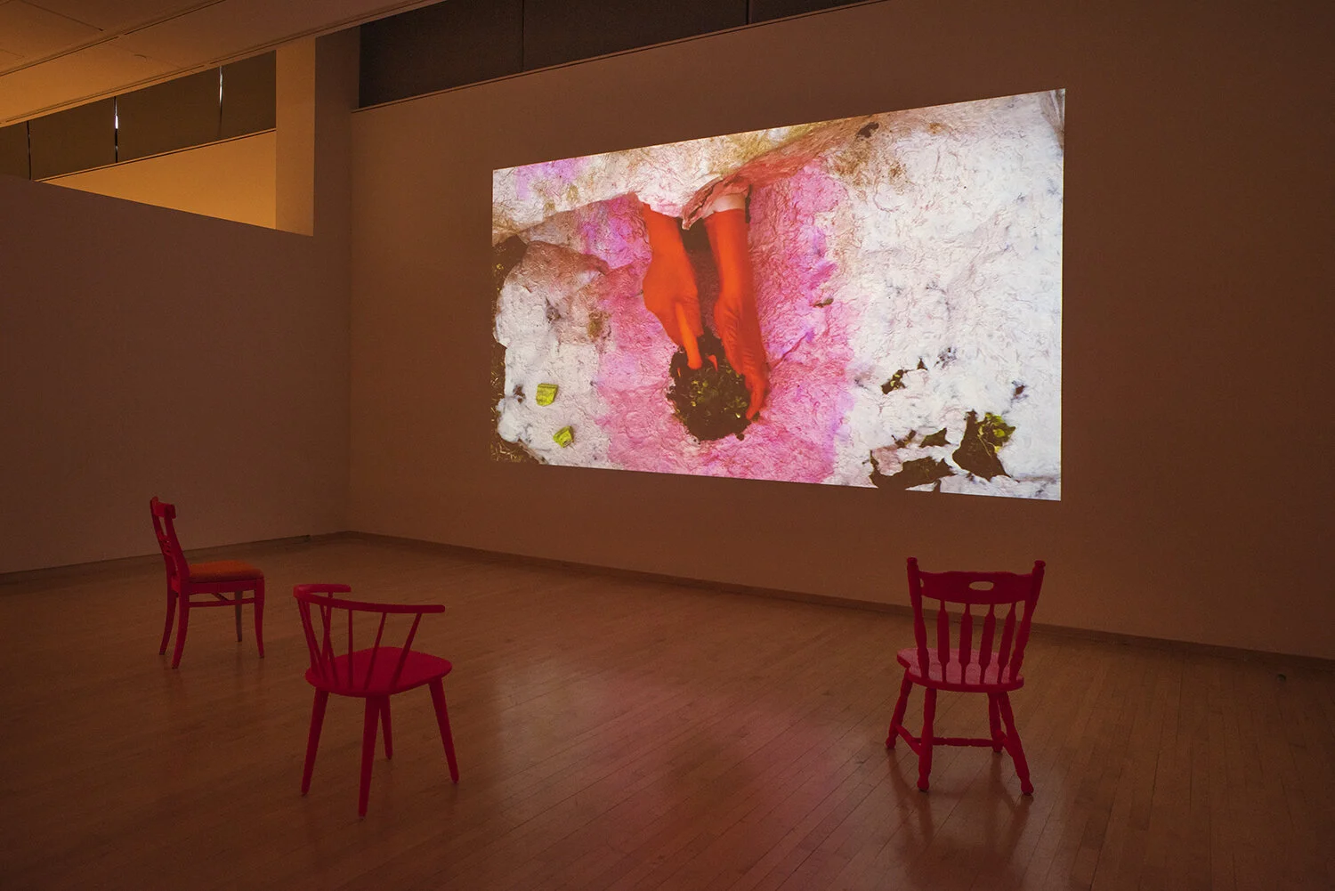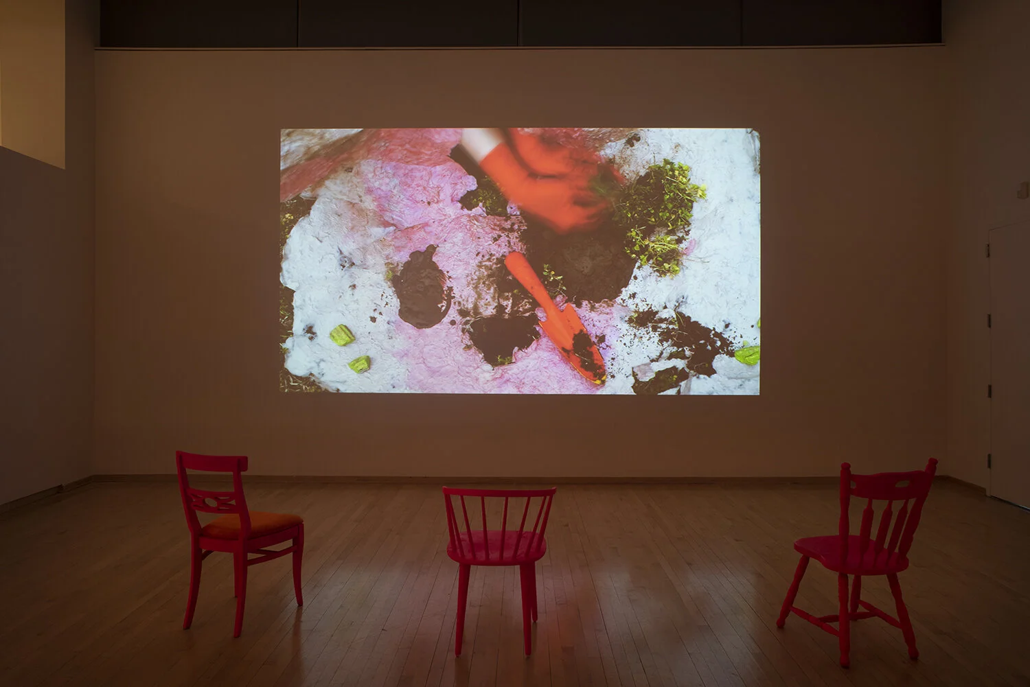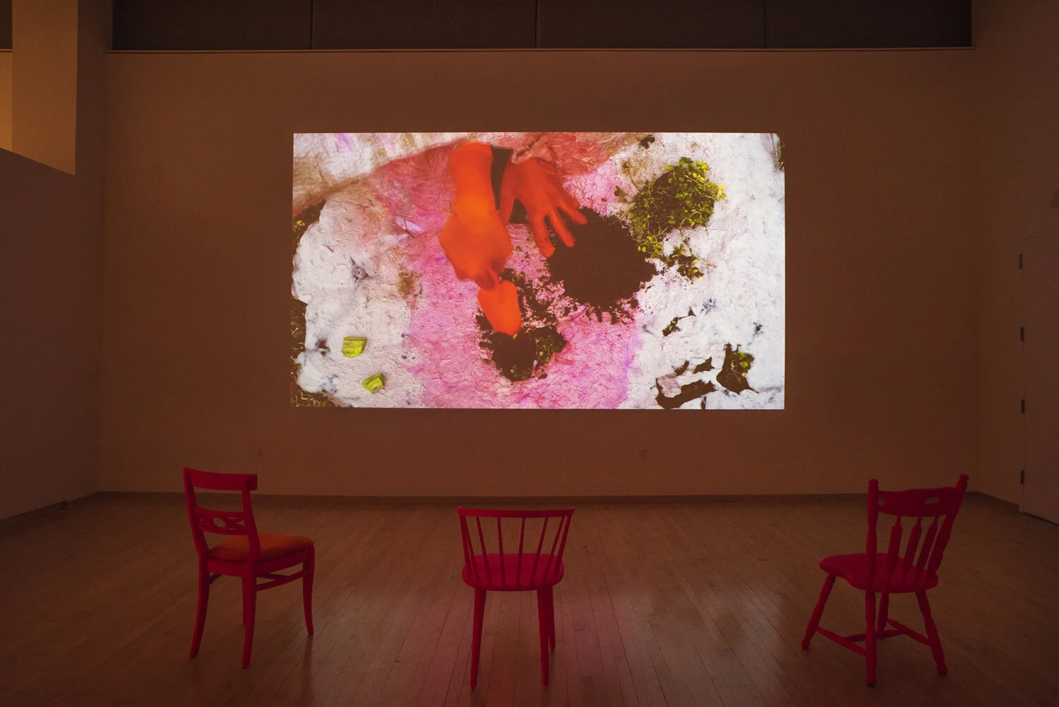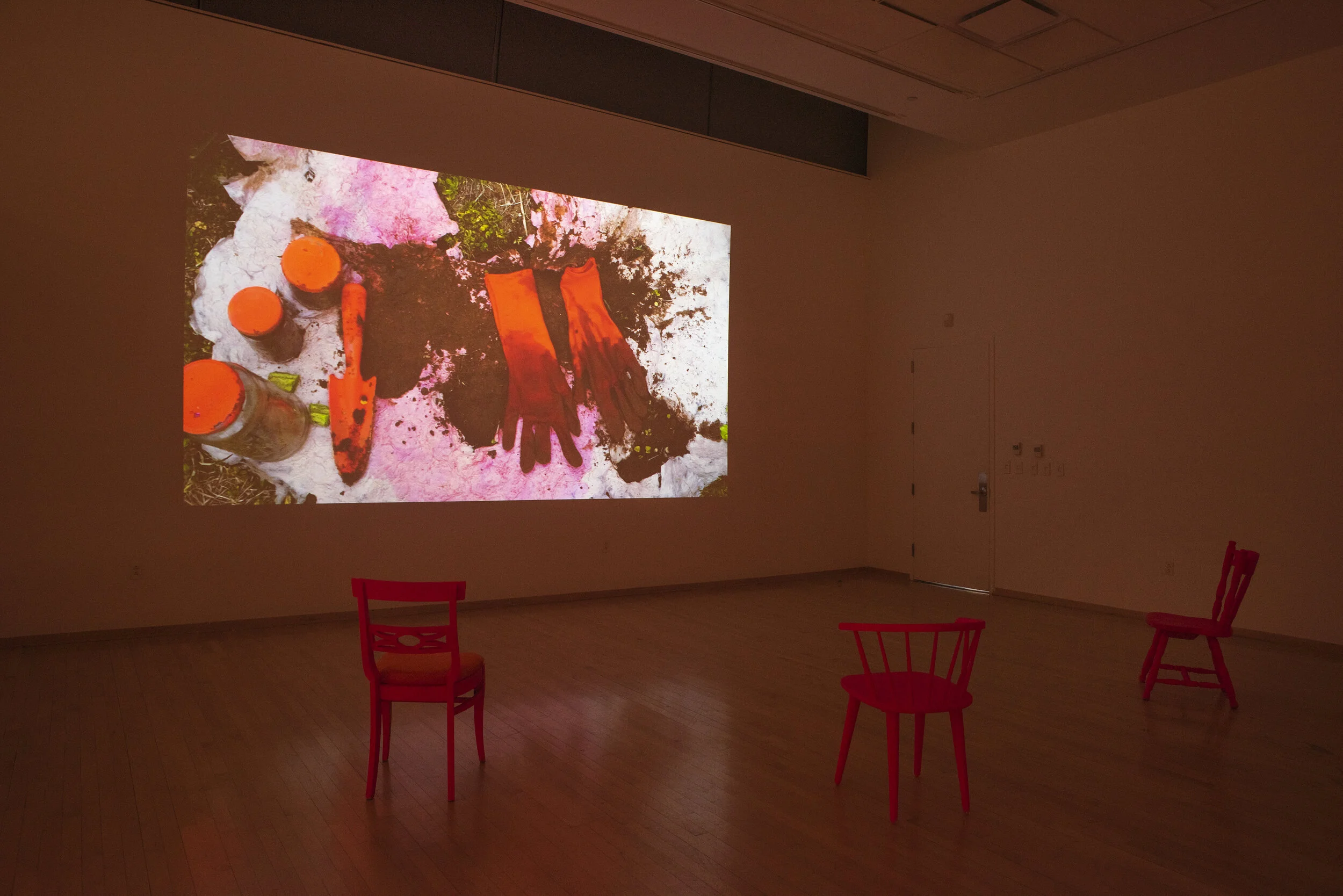 “openings,” 2021, video still and three chairs, 12 ft x 8 ft, Photo credit: Neighboring States
